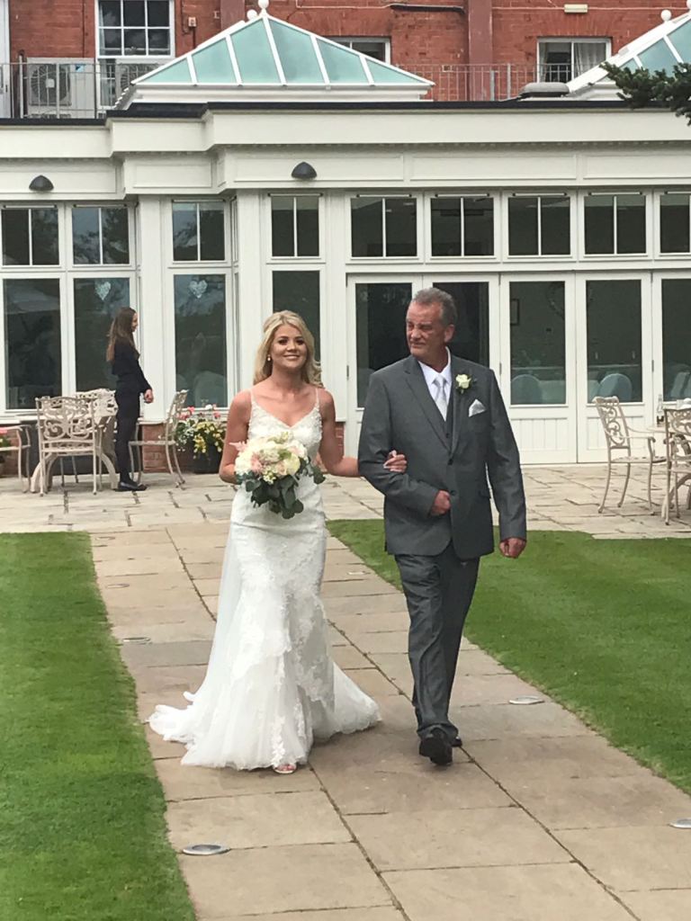 When we walked down the aisle it was a tad surreal. I was very aware that this was a big deal and everyone was watching us. Linz looked amazing and held it together, we all found seats to sit on and all was well. A wasp landed on my bouquet but I dealt with it. The ceremony was lovely, everyone was in awe and Linz and Loz were relaxed and no one stumbled over any words.